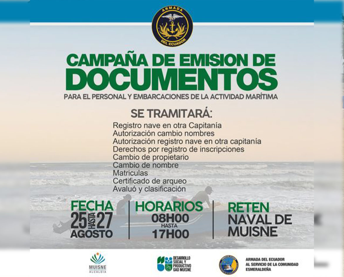 Durante 3 dias , desde el miercoles 25 de agosto hasta el 27 de agosto, inspectores de la Armada del Ecuador y el Departamento de Desarrollo Social del GAD de Muisne, inician el proceso de registro de naves del canto Muisne, en el marco de la campa帽a de matriculaci贸n gratuita...