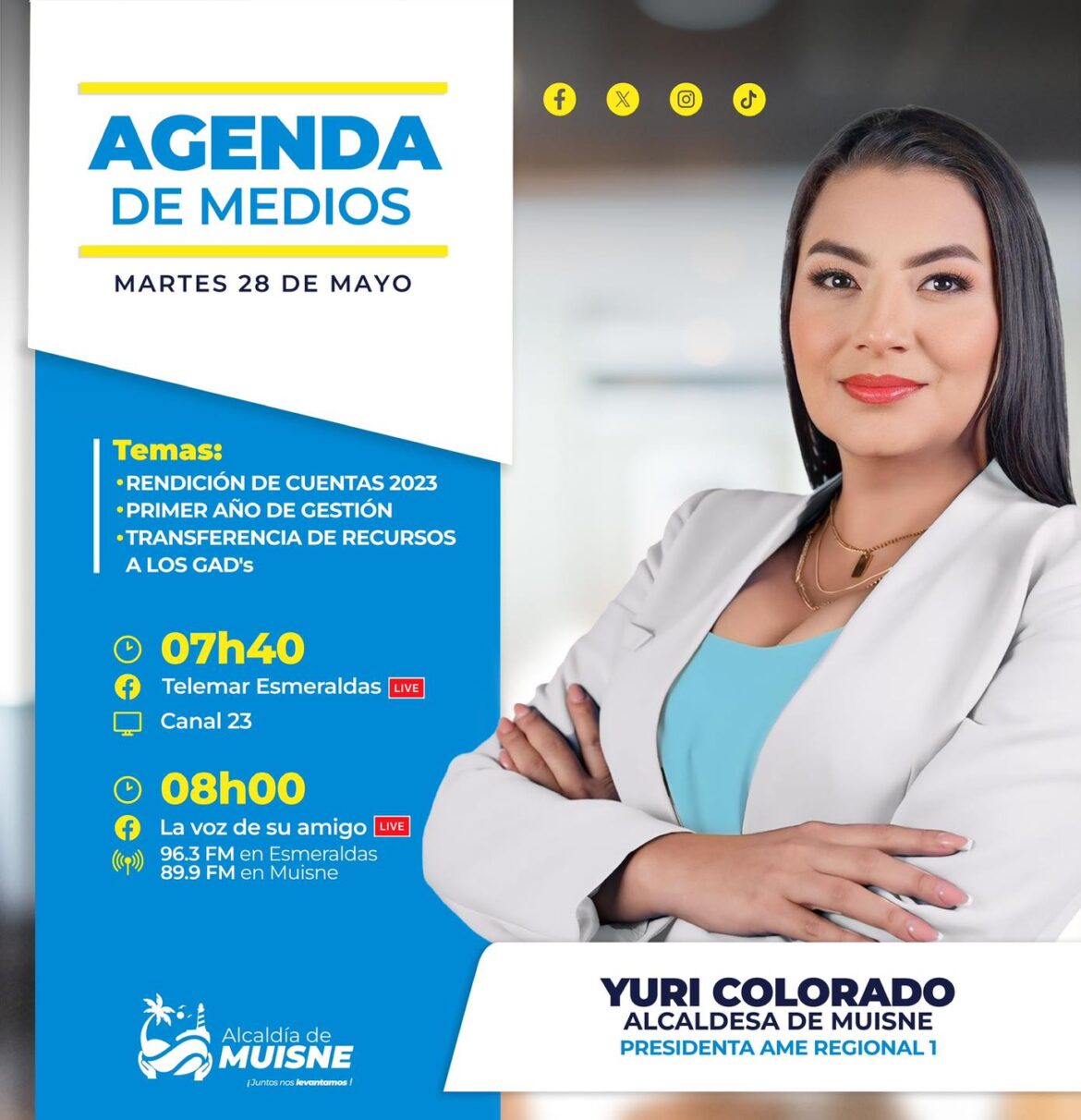 Durante el cumplimiento de una agenda de medios en la ciudad de Esmeraldas, la alcaldesa de Muisne destac贸 los logros de su administraci贸n municipal en el primer a帽o de gesti贸n. Tanto en el medio de comunicaci贸n Telemar Canal 23 como en radio La Voz de Su Amigo 96.3 y 89.7...