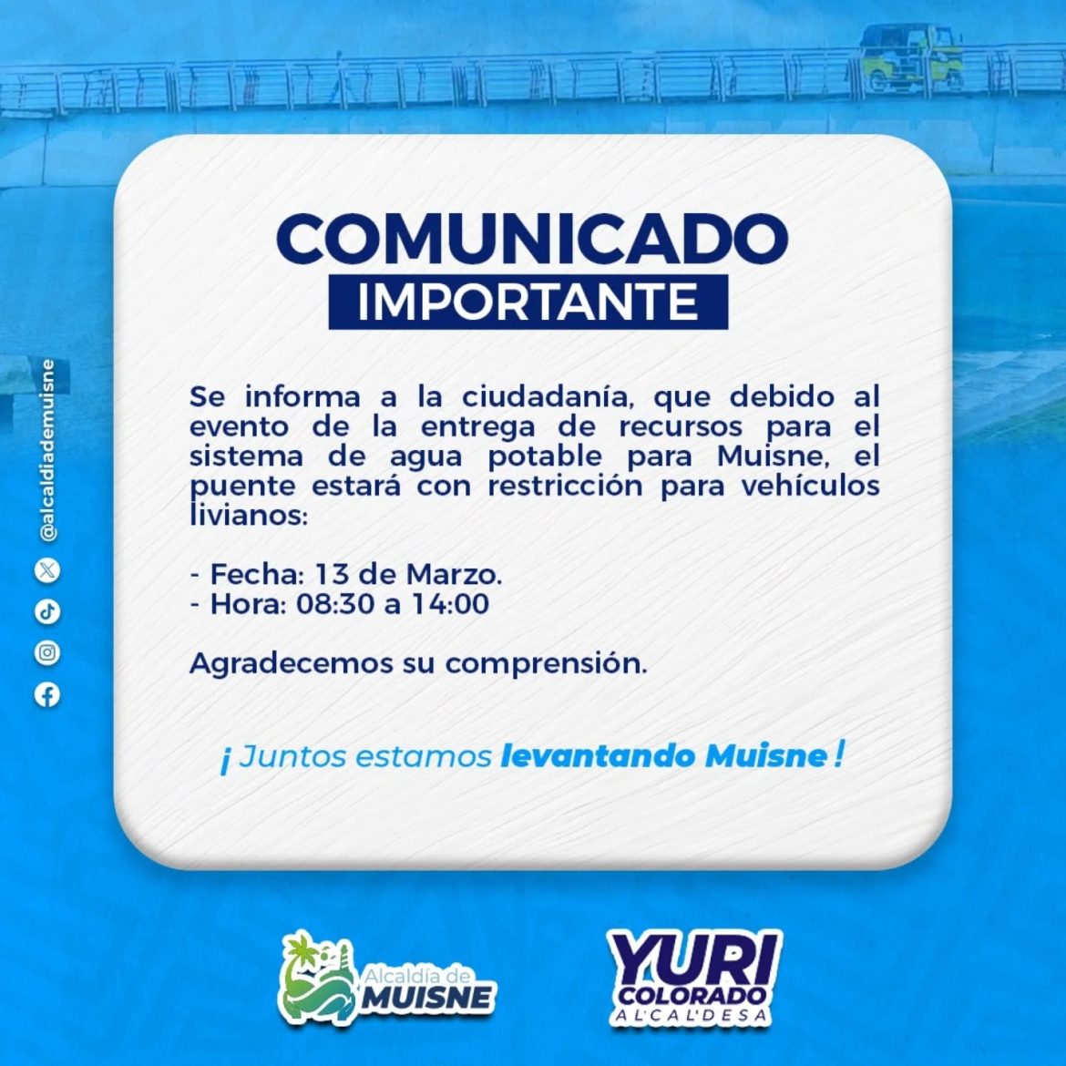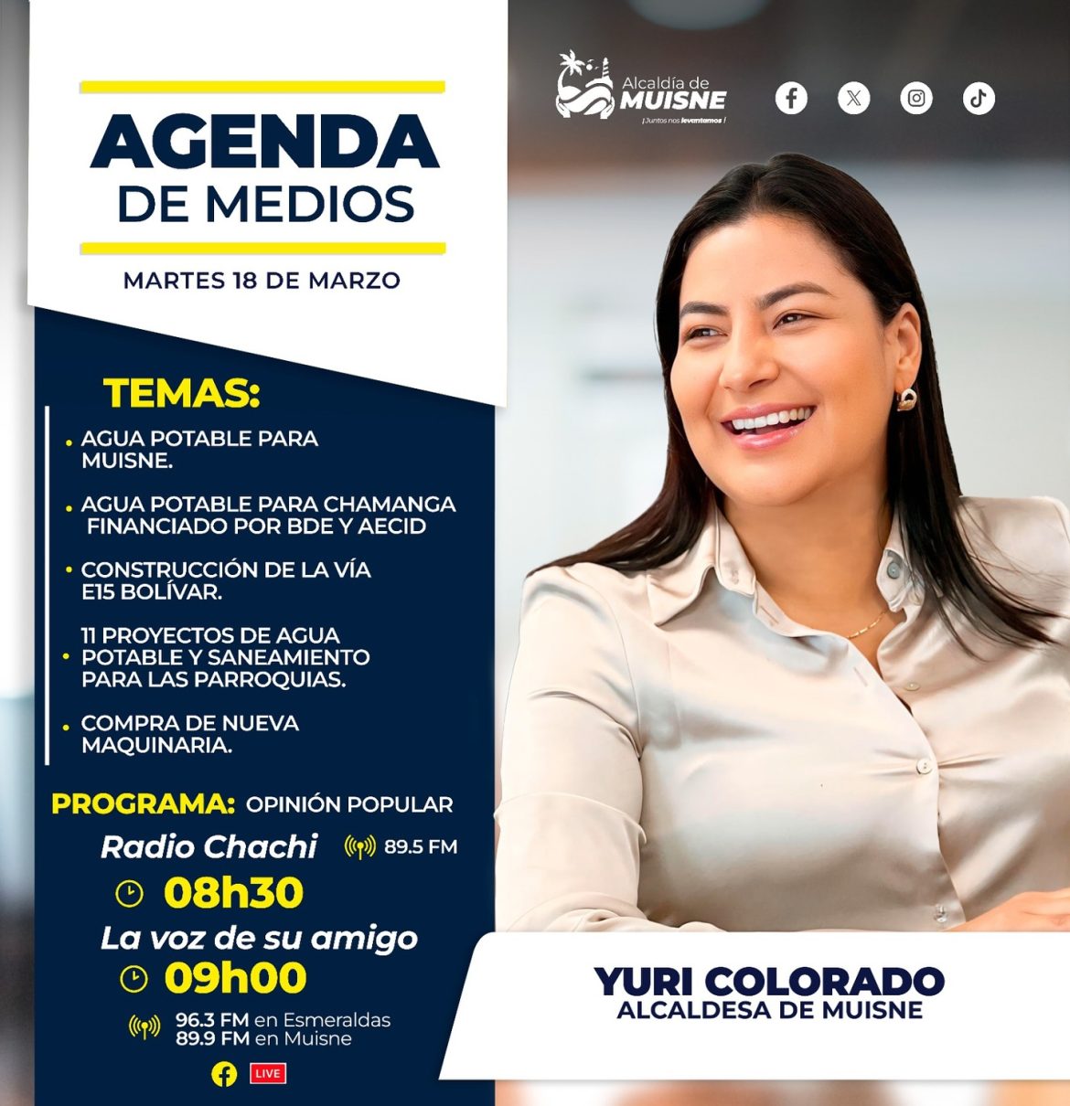 Agenda de medios. Sigue la entrevista que brindar谩 nuestra alcaldesa, Yuri Colorado M谩rquez, este martes 18 de marzo en: Radio Chachi a las08h30 La voz de su amigo a las 09h00 #juntosestamoslevantandomuisne