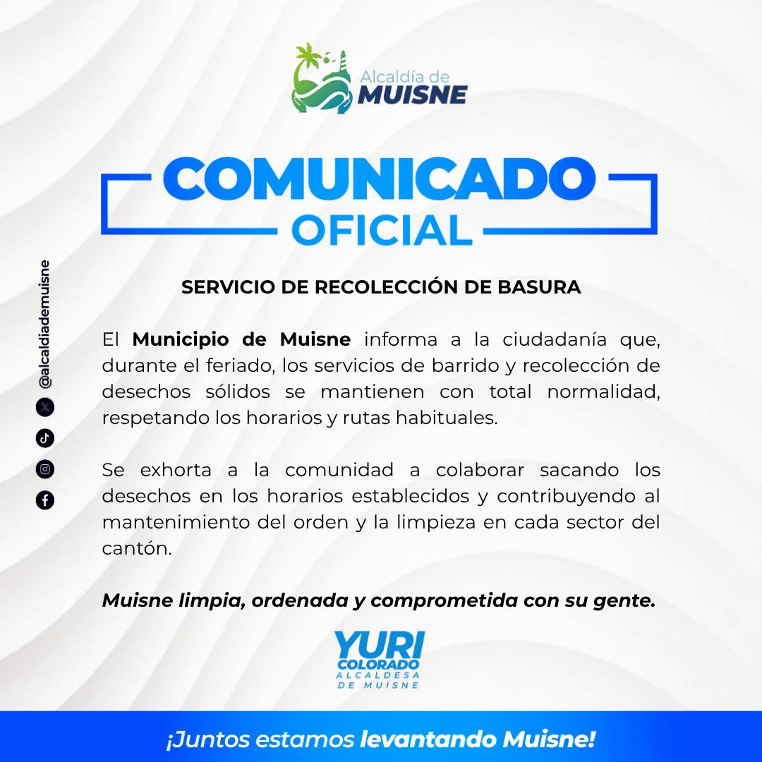 Apoyo al turismo comunitario en la Playita de Bunche La alcaldesa de Muisne, Yuri Colorado Márquez, entregó equipamiento a la Asociación de Servicios Turísticos de la Playita de Bunche, fortaleciendo así la prestación de servicios de hospedaje en la zona. La dotación incluyó muebles, camas de bambú, colchones, un rótulo...