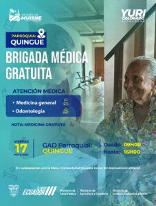 Te invitamos cordialmente a participar en nuestra brigada médica gratuita, donde ofreceremos servicios de Medicina General y Odontología. El evento se llevará a cabo en el GAD-Parroquial de Quingue.