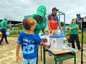 Las familias de esta comunidad que no tienen agua potable, recibieron con alegrรญa la capacitaciรณn del uso del kit purificador, el cual permite mejorar la calidad de vida y la salud, principalmente de los mรกs pequeรฑos.