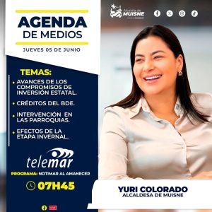 Este jueves acompáñanos en el programa “Notimar al Amanecer” por Telemar a las 07H45, donde nuestra alcaldesa Yuri Colorado informará sobre temas prioritarios para nuestro cantón.
