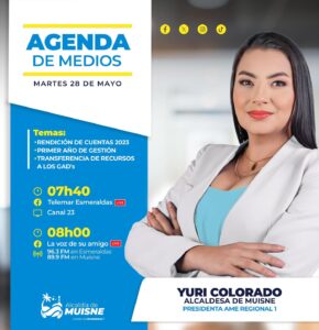 Alcaldes estará en diálogo con medios de comunicación de la ciudad de Esmeraldas 28 mayo, 2024 La alcaldesa de #Muisne Yuri Colorado, en diálogo con medios de comunicación de la ciudad de #Esmeraldas brindará detalles de los siguiente temas. Rendición de cuentas 2023. Primer año de gestión. Transferencia de recursos a los Gad’s ¡Acompañanos! Tags: No tag. Twitter Facebook Tumblr