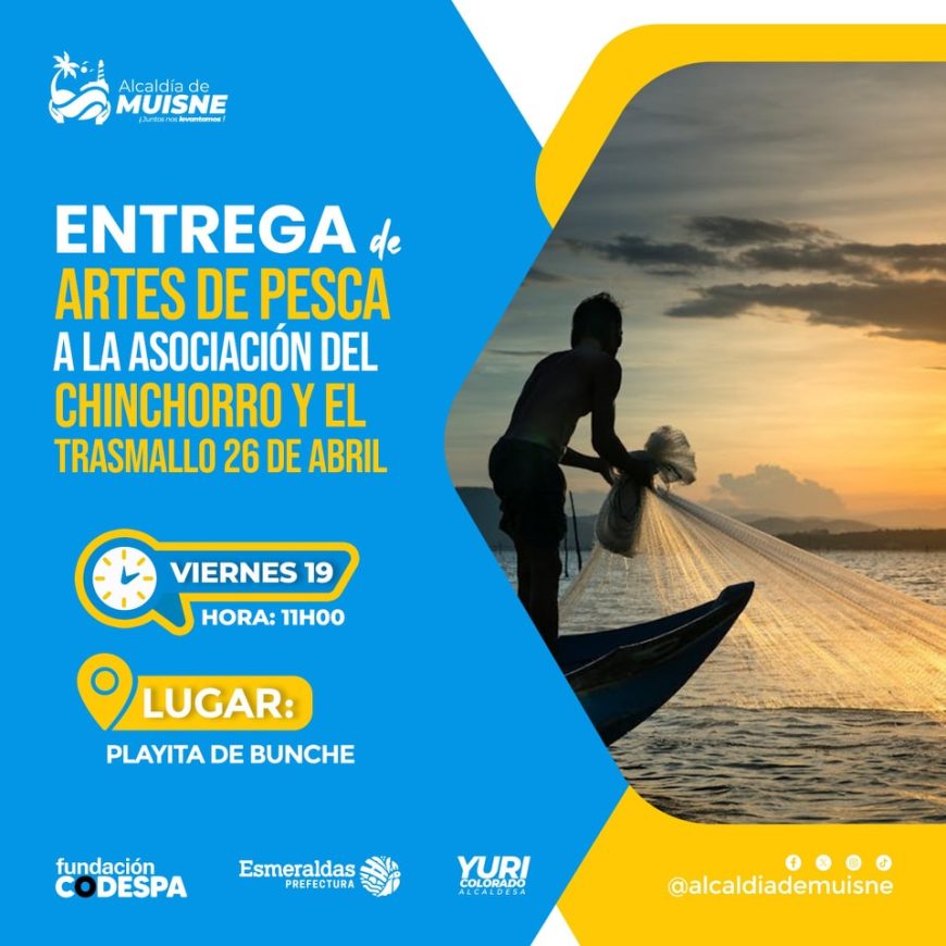 La Prefectura de Esmeraldas junto a la Alcaldía de Muisne, invita a la ciudadanía al evento de entrega de MATERIALES DE ARTES DE PESCA, que se realizará en la playita de Bunche del cantón Muisne.