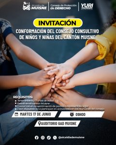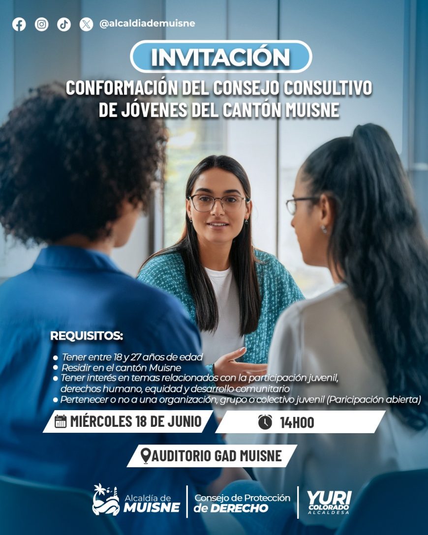 Te invitamos a ser parte de la Conformación del Consejo Consultivo de Jóvenes del Cantón Muisne, un espacio de participación para alzar tu voz y trabajar por una sociedad más justa, equitativa y participativa.