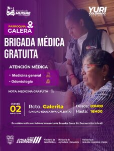 Este jueves 2 de mayo, en la Parroquia Galera, se realizará la brigada médica gratuita con atención en medicina general y odontología 🦷, con la participación de representantes de la Alcaldía de Muisne, Ministerio de Salud Pública (MSP), Ministerio de Agricultura y Ganadería (MAG) y Ministerio de Inclusión Económica y Social (MIES).
