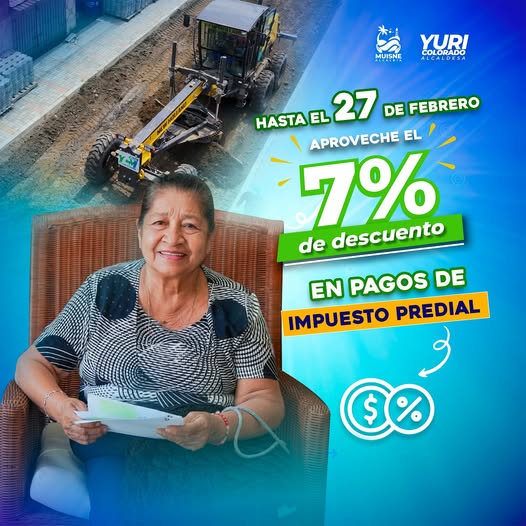¡Sigue contribuyendo con tus impuestos! Aprovecha el 7 % de descuento en el pago de tus impuestos prediales hasta el 27 de febrero. Tu aporte se transforma en obras, maquinaria en territorio y mejores servicios para nuestro cantón.