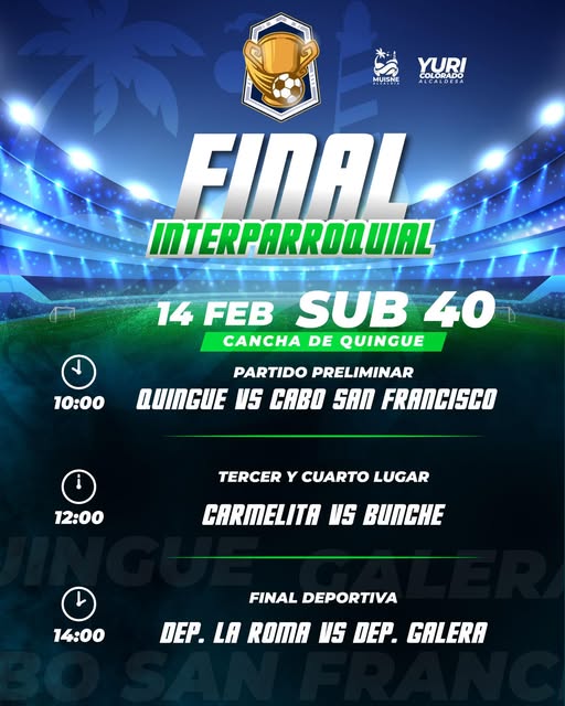 Hoy, 14 de febrero, la pasión del fútbol se vive en la Cancha de #Quingue. No es solo un partido, es la gran Final #Interparroquial Sub-40. Lugar: Cancha de Quingue 10:00 AM: Quingue vs. Cabo San Francisco (Preliminar) 12:00 PM: Carmelita vs. Bunche (3er y 4to lugar) #Muisne #Sub40 #MuisneTuLugarSeguro...