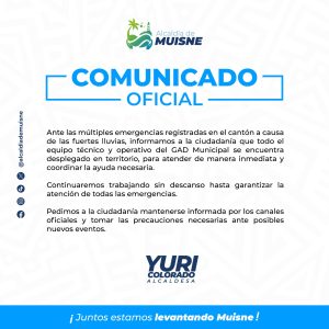 Ante las mรบltiples emergencias registradas en el cantรณn a causa de las fuertes lluvias, informamos a la ciudadanรญa que todo el equipo tรฉcnico y operativo del GAD Municipal se encuentra desplegado en territorio, para atender de manera inmediata y coordinar la ayuda necesaria.