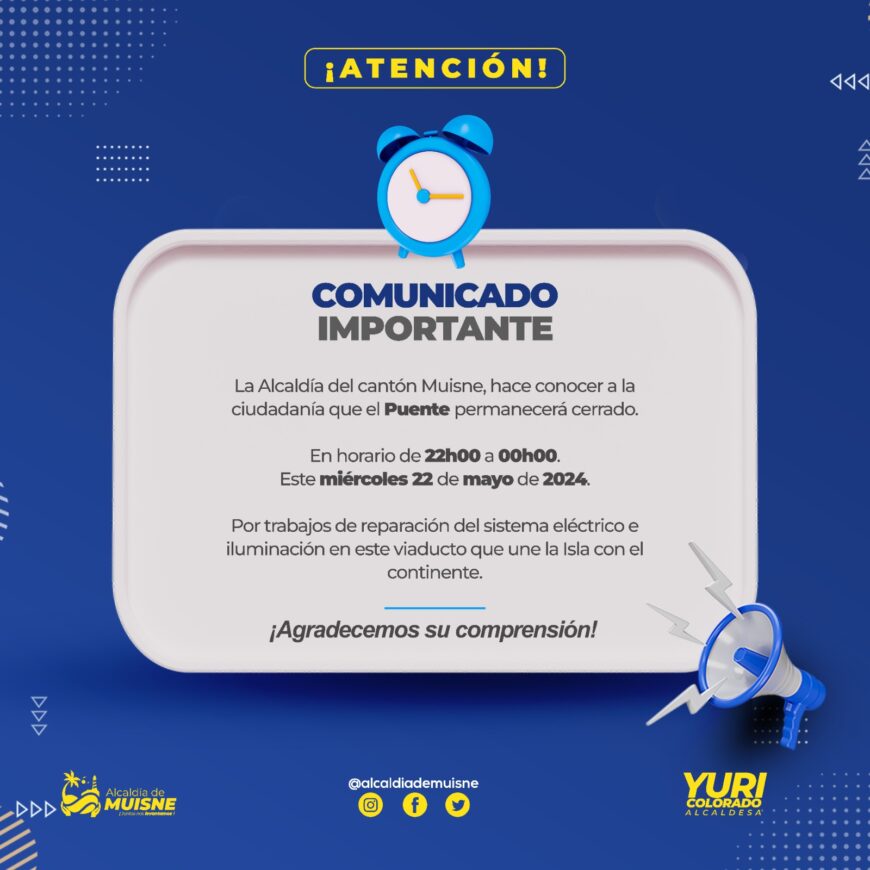 La Alcaldía comunica a la ciudadanía muisneña, que el paso a peatones y vehículos por el puente que une la isla con el continente, será suspendido este miércoles 22 de mayo.