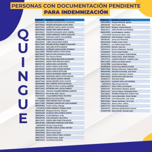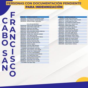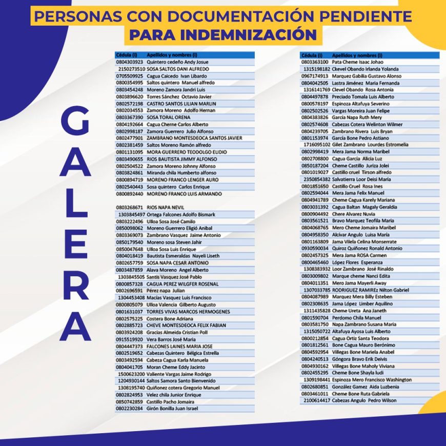 A continuación, publicamos la lista de personas que aún no han cumplido con estos requisitos. Si tu nombre aparece en la lista, por favor acércate lo antes posible a las oficinas del GAD de Muisne para entregar los documentos necesarios y asegurar tu indemnización.