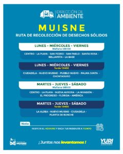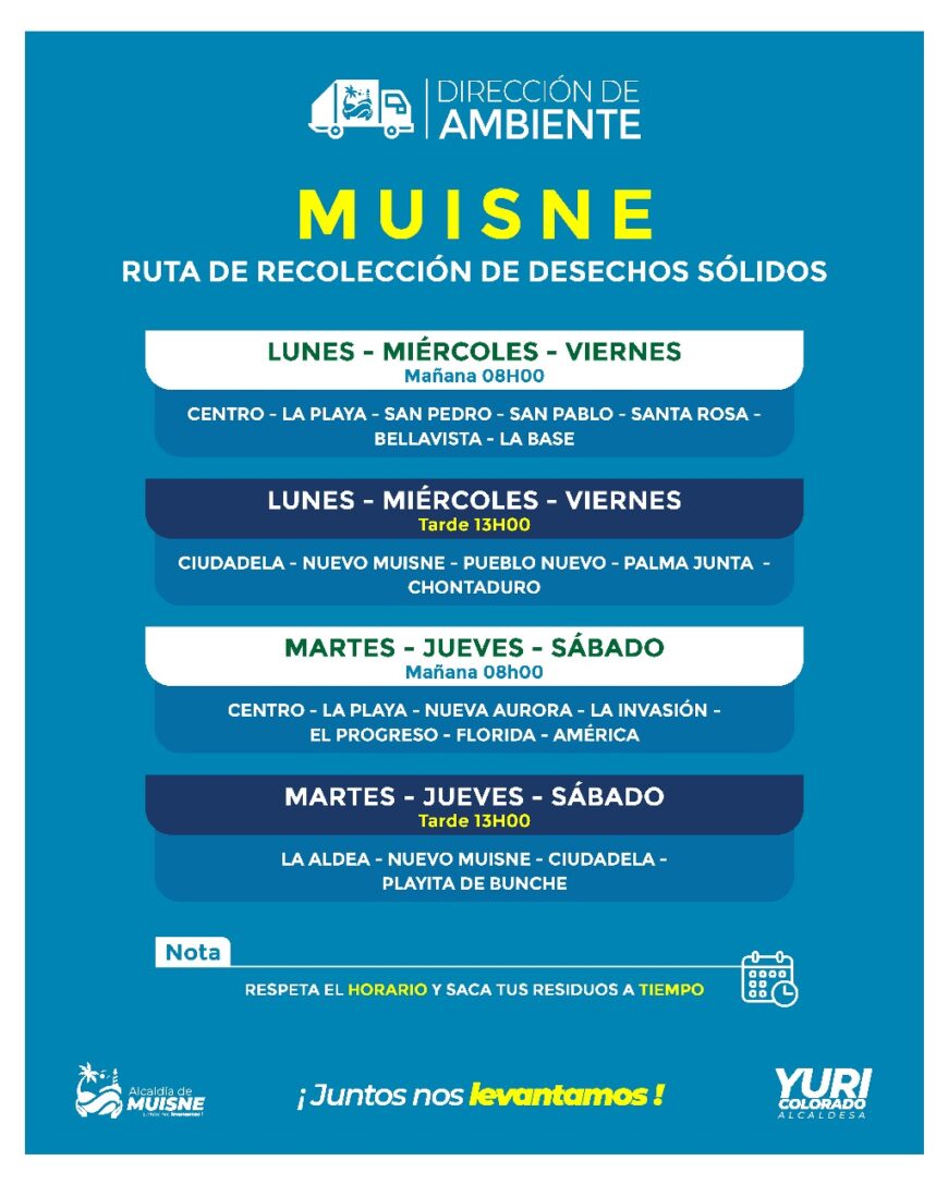 En Muisne, la limpieza y el orden son pilares de nuestra comunidad. Recuerda que los dรญas y horarios para sacar la basura estรกn establecidos por el Municipio para mantener nuestra ciudad impecable. ยกHaz tu parte y contribuye con la limpieza de tu entorno!.