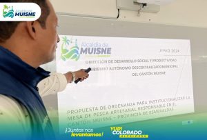 La ordenanza para institucionalizar la Mesa de Pesca Artesanal Responsable en el cantón Muisne – provincia de Esmeraldas. El objetivo de esta ordenanza propuesta desde la Dirección de Desarrollo Social y Productividad del GAD Municipal es planificar, promover y gestionar el fortalecimiento de la cadena de valor de la pesca, mediante la coordinación y cooperación entre los actores institucionales, organizaciones pesqueras y la sociedad civil, buscando que las acciones reduzcan los impactos negativos hacia los ecosistemas.