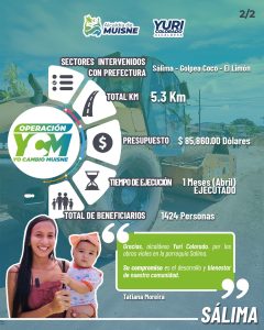 Gracias al plan Yo Cambio Muisne, más de 1800 personas se benefician con la rehabilitación de 5.3 km de vías en sectores clave como Golpeacoco Sálima, El Limón, entre otros.