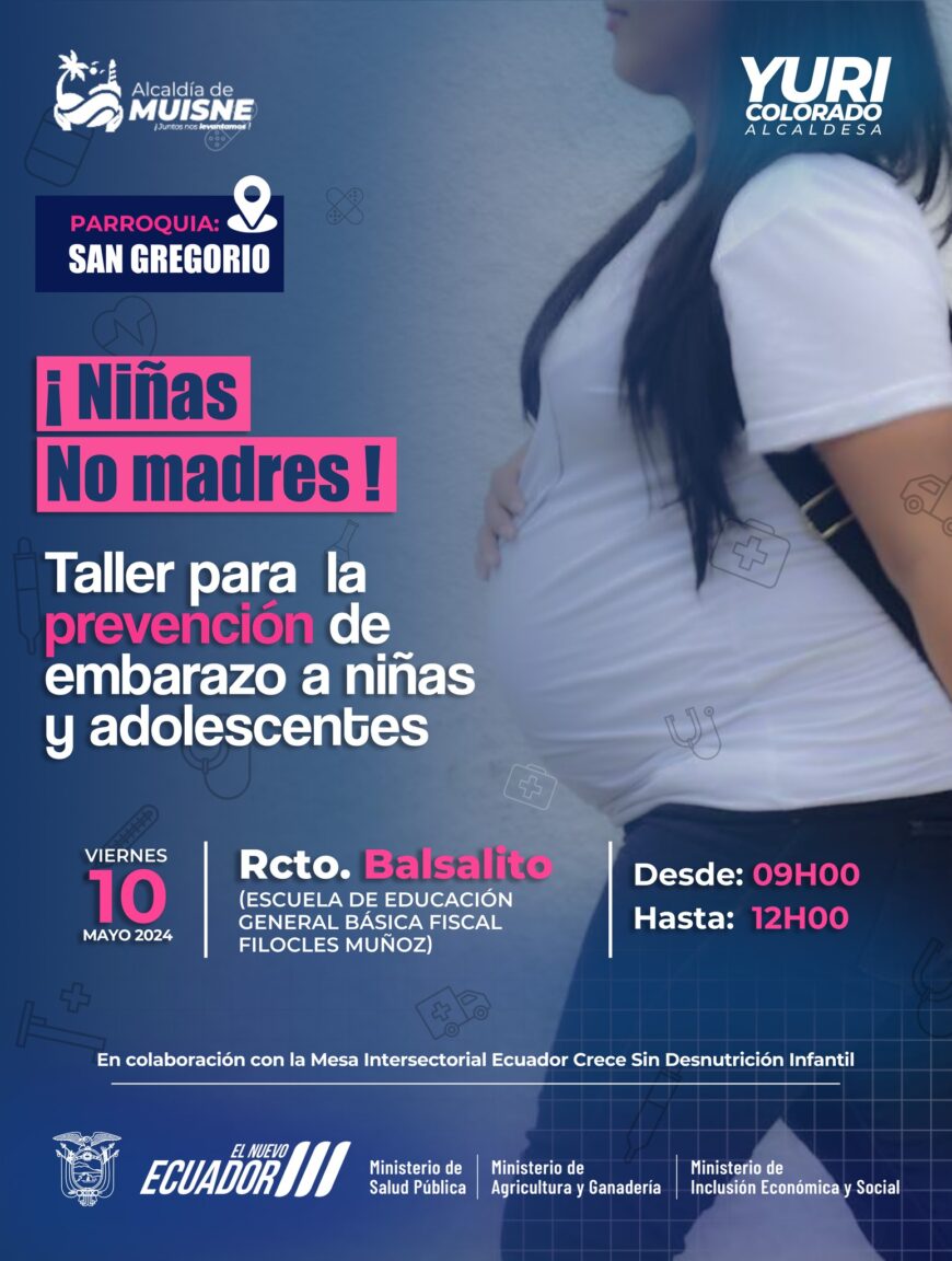 Invitación Especial 9 mayo, 2024 Invitación Especial Taller: ¡Niñas no madres! Organizado por: Alcaldía de Muisne Fecha: Viernes, 10 de mayo Hora: 08:00 a 12:00 Lugar: Recinto Balsalito, Parroquia San Gregorio (Escuela de educación general básica fiscal Filocles Muñoz) Objetivo: Prevenir embarazos en niñas y adolescentes. ¡Acompáñanos en esta jornada de concienciación y aprendizaje! Tu presencia es esencial para hacer la diferencia. Tags: No tag. Twitter Facebook Tumblr