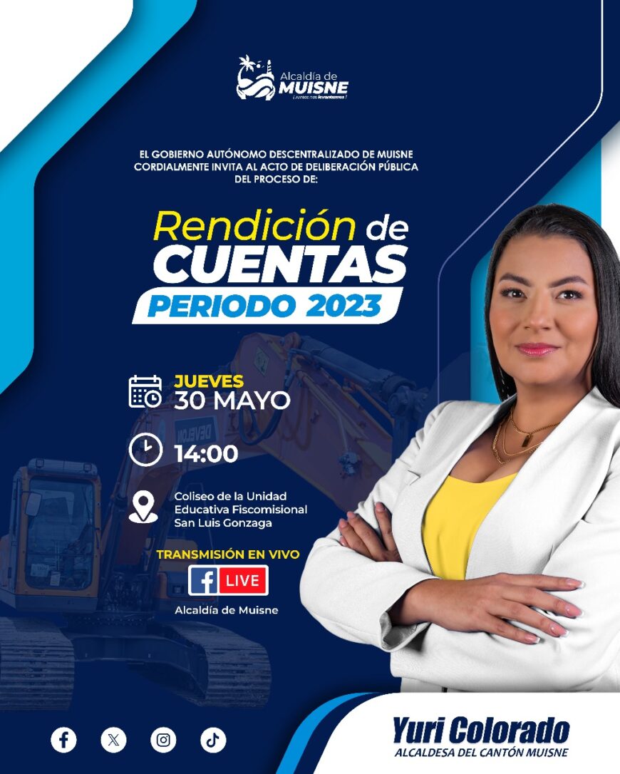 La Alcaldía de Muisne, bajo el liderazgo de la alcaldesa Yuri Colorado Márquez, está organizando el proceso de rendición de cuentas, en cumplimiento con las disposiciones de la Ley Orgánica de Participación Ciudadana (LOPC).
