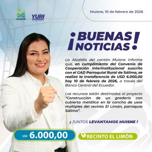 La Alcaldía de Muisne, gracias a la gestión de nuestra alcaldesa Yuri Colorado Márquez, realizó la transferencia de USD 6.000,00 al GAD Parroquial de Sálima