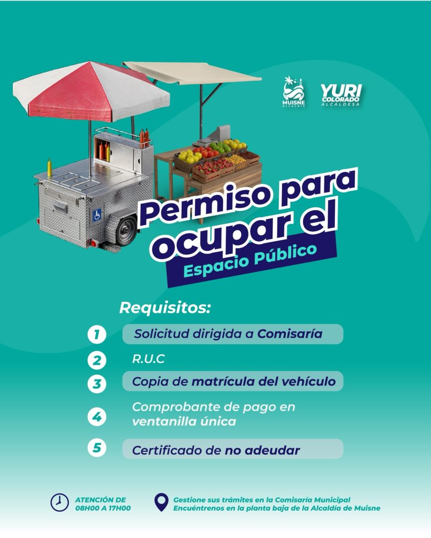 Solicita tu permiso en la Comisaría Municipal, en la planta baja de la Alcaldía de Muisne.