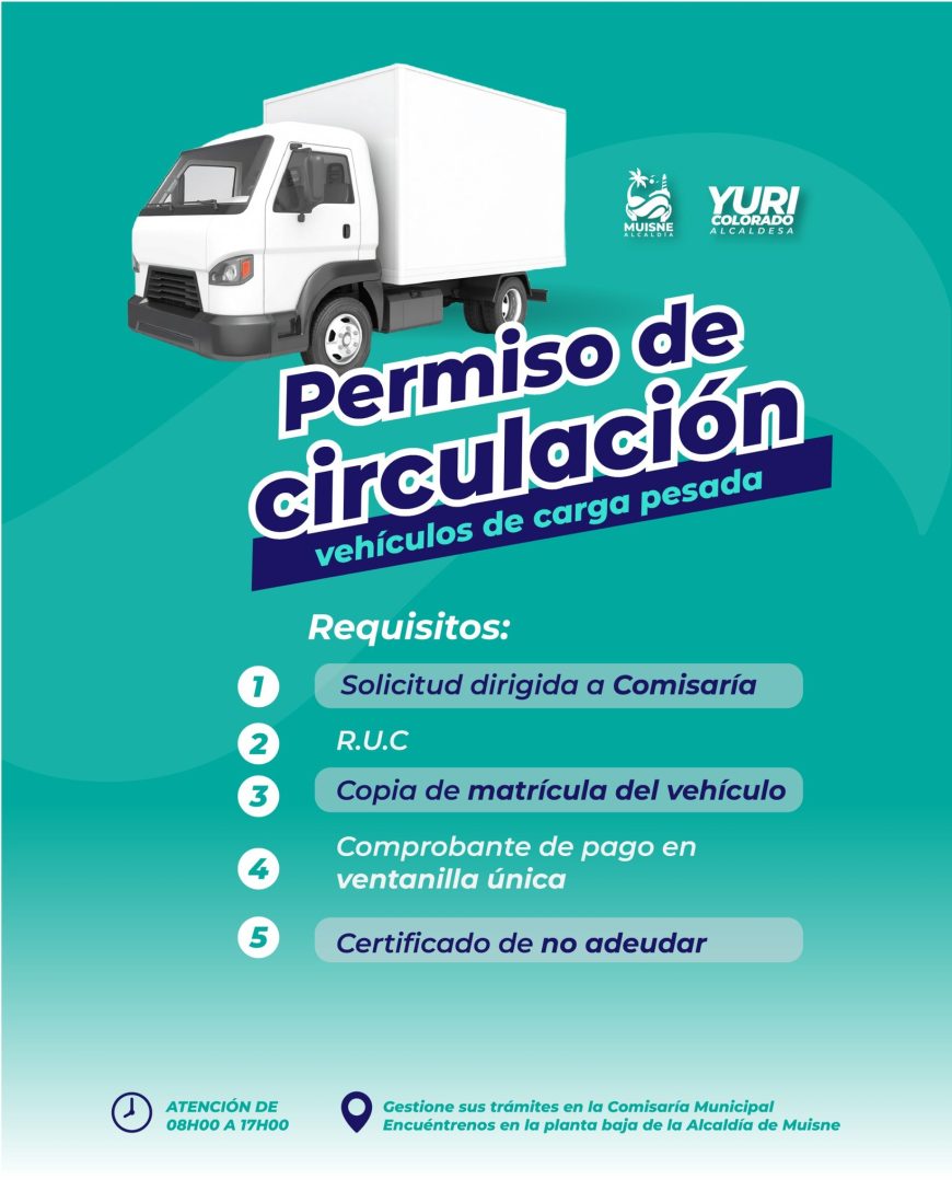 En la Alcaldía de Muisne trabajamos para mantener el orden y la seguridad en nuestro cantón. Por eso, invitamos a los propietarios de vehículos de carga pesada a realizar el trámite del permiso de circulación, un requisito importante para cuidar nuestras vías y circular de manera responsable.