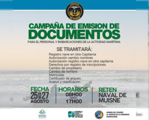 Durante 3 dias , desde el miercoles 25 de agosto hasta el 27 de agosto, inspectores de la Armada del Ecuador y el Departamento de Desarrollo Social del GAD de Muisne, inician el proceso de registro de naves del canto Muisne, en el marco de la campaña de matriculación gratuita de embarcaciones pesqueras artesanales.